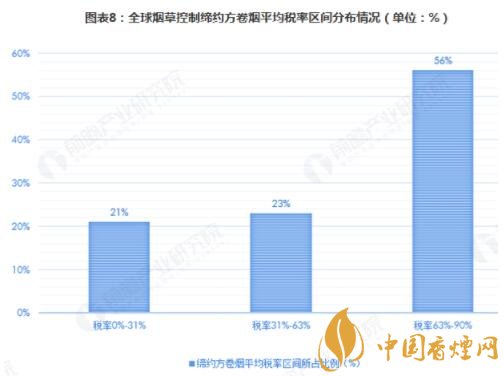 據(jù)統(tǒng)計(jì),在全球煙草控制締約方實(shí)施煙草稅收政策的國家中,稅率在63%-90%高稅率的國家數(shù)量占到了56%;實(shí)施31%-63%稅率的締約方數(shù)量也占到了23%;31%以下稅率的締約方數(shù)量占比為21%。