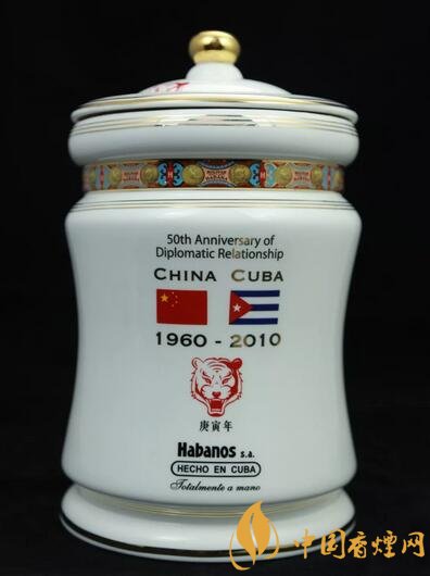 該藏品采用獨(dú)特瓷罐包裝,瓷罐上印有中國古巴國旗、中古建交時(shí)間、中國虎頭圖騰等,并用中文標(biāo)注上了“庚寅年”,罐蓋上附有加溫器,并用軟木做密封。內(nèi)含25支環(huán)徑為52、長度為 6.4英寸的雙魚雷型雪茄。全球限量2010罐,此罐編號(hào)為532號(hào),由時(shí)任古巴駐華大使白詩德(Alberto Jesus Blanco Silva)簽贈(zèng)。