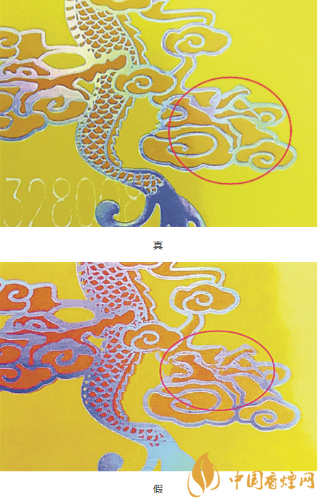 假煙:印刷粗糙,圖案模糊,祥云圖案無凹凸感。