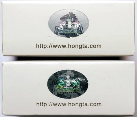 背面商標(biāo)紙印刷工藝差異對(duì)比:真品商標(biāo)紙采用白卡紙,凹印印刷,“Hongtashan”字體用手摸沒(méi)有凹凸感,“紅塔”左邊上下兩朵云距離塔身較遠(yuǎn);假煙采用高清掃描仿制印刷,“Hongtashan”字體用手摸有凹凸感,“紅塔”左邊上下兩朵云離塔較近,與真品特征存在明顯差異。