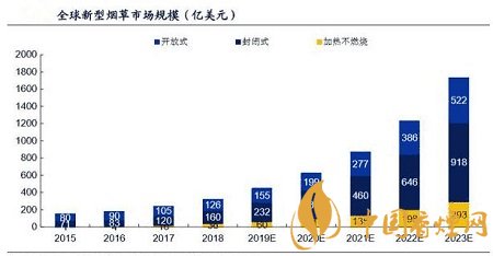 與傳統(tǒng)卷煙市場衰退呈鮮明對比的是新型煙草市場規(guī)模的逐年提升。全球新型煙 草市場規(guī)模以 27.9%的復(fù)合年增長率從 2013 年的 94 億美元迅速增加至 2018 年的 323 億美元。弗若斯特沙利文預(yù)計到 2023 年全球新型煙草市場規(guī)模將高達 1734 億美元。新型煙草煙作為一種替代香煙的電子產(chǎn)品,有著與香煙類似的外 觀、煙霧、味道和感覺。而與香煙相比卻不含有香煙煙霧中的 7000 種有害化學(xué) 成分,因此受到越來越多人的青睞。