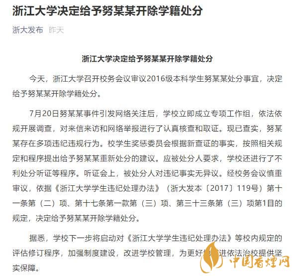 【浙大犯強(qiáng)奸罪學(xué)生被開除學(xué)籍】浙江大學(xué)7月31日深夜發(fā)布消息,努某某在校期間存在多項(xiàng)違紀(jì)違規(guī),浙江大學(xué)決定給予努某某開除學(xué)籍處分,浙大回應(yīng)學(xué)生犯強(qiáng)奸罪獲刑被留校察看,知情人透露其經(jīng)常出入酒吧,成績很差。下面來看看通報(bào)內(nèi)容!