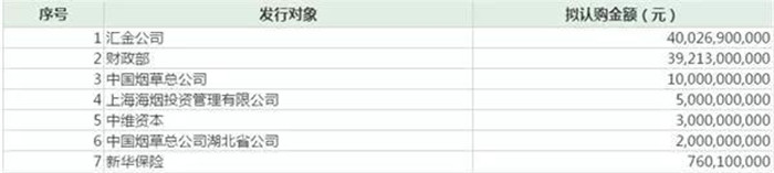 除去匯金公司和財(cái)政部,其余的發(fā)行對(duì)象中,中國(guó)煙草總公司、上海海煙投資管理有限公司、中維資本、中國(guó)煙草總公司湖北省公司四家均為“煙草系”法人。