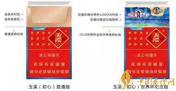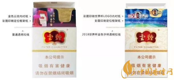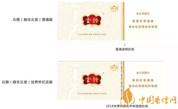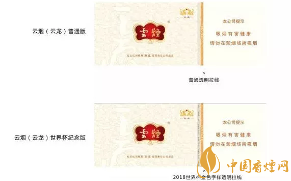 大家可能也了解國產(chǎn)中高檔香煙價格表和圖片,云煙占據(jù)主要市場。本次世界杯版對以下產(chǎn)品的條盒、小盒進行了局部改版調(diào)整,具體調(diào)整:小盒翻蓋內(nèi)定位卡紙印刷世界杯元素、小盒內(nèi)襯紙彩圖印刷世界杯元素、小盒拉線增加“2018世界杯”金色字樣、條盒拉線增加“2018世界杯”金色字樣。下面一起來看看細節(jié)對比圖吧。