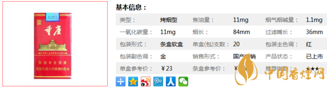 重慶紅香煙,煙長(zhǎng)84mm,過(guò)濾嘴長(zhǎng):36mm,焦油量11mg,采用濾嘴通風(fēng)技術(shù),有效降低了煙氣中有害物質(zhì)的含量,順應(yīng)了目前降焦減害的發(fā)展方向。味道醇淡順口,比較合口味,總得來(lái)說(shuō)很不錯(cuò),煙燃燒很好,口感一般,偶爾抽抽還是可以。