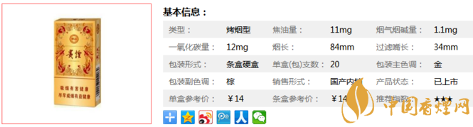 | 類型 :烤煙型 | 焦油量 :11mg | 煙氣煙堿量 :1.1mg | 一氧化碳量 :12mg |