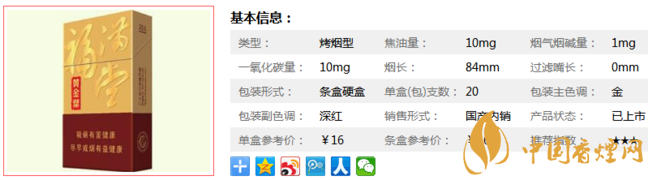 | 類(lèi)型 :烤煙型 | 焦油量 :10mg | 煙氣煙堿量 :1mg | 一氧化碳量 :10mg |