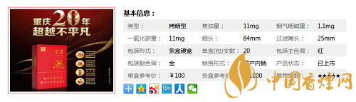 天子重慶20年是一款具有重慶地域特色的卷煙,按常規(guī),一支煙只有一種味道,但是天子重慶20年首創(chuàng)一煙四味,一吸本香,二吸茶香、三吸花香、四吸茶花香,四種口味自由切換。經(jīng)香煙網(wǎng)小編市場(chǎng)調(diào)查價(jià)格為100元/包。
