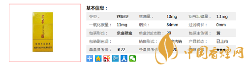 | 類型 :烤煙型 | 焦油量 :10mg | 煙氣煙堿量 :1.1mg | 一氧化碳量 :11mg |