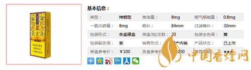 類型 :烤煙型 焦油量 :8mg 煙氣煙堿量 :0.8mg 一氧化碳量 :8mg