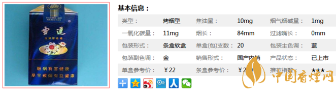 類型 :烤煙型 焦油量 :10mg 煙氣煙堿量 :1mg 一氧化碳量 :11mg