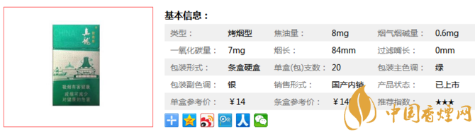| 類型 :烤煙型 | 焦油量 :8mg | 煙氣煙堿量 :0.6mg | 一氧化碳量 :7mg |