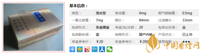 | 煙長(zhǎng):84mm | 過(guò)濾嘴長(zhǎng):33mm | 包裝形式:條盒硬盒 | 單盒(包)支數(shù):20 |