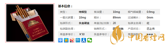 | 煙長:89mm | 過濾嘴長:25mm | 包裝形式:條盒硬盒 | 單盒(包)支數(shù):20 |