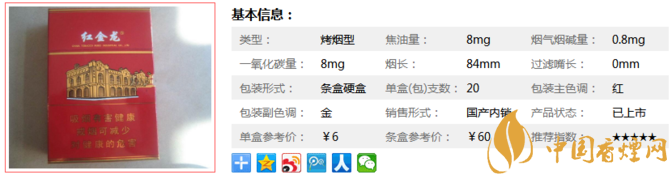 | 類型 :烤煙型 | 焦油量 :8mg | 煙氣煙堿量 :0.8mg | 一氧化碳量 :8mg |