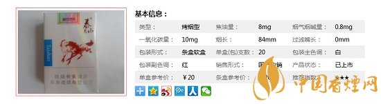 | 類型 :烤煙型 | 焦油量 :8mg | 煙氣煙堿量 :0.8mg | 一氧化碳量 :10mg |
