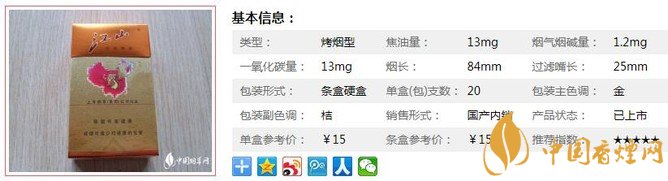 珍品江山——烤煙型,84mm硬盒,分數(shù)段A上。江山牌卷煙單支煙氣中有害成分比普通卷煙減少50%以上。降焦之后口感稍微淡了一點,原來的中藥調(diào)香似乎少了一些,但并不影響總體的口味。下面我們一起來看江山珍品的參數(shù)信息:焦油量:13mg. 煙堿量:1.2mg. 一氧化碳量:13mg.