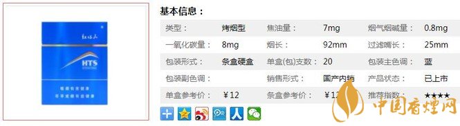 | 類型 :烤煙型 | 焦油量 :7mg | 煙氣煙堿量 :0.8mg | 一氧化碳量 :8mg |