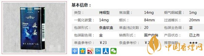 | 類型 :烤煙型 | 焦油量 :14mg | 煙氣煙堿量 :1mg | 一氧化碳量 :14mg |