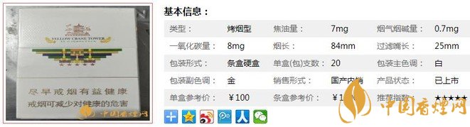 | 類型 :烤煙型 | 焦油量 :7mg | 煙氣煙堿量 :0.7mg | 一氧化碳量 :8mg |