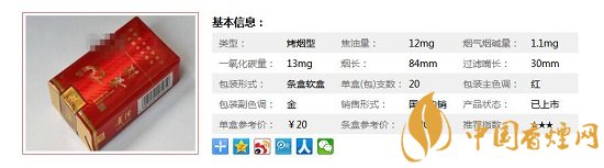 | 類型 :烤煙型 | 焦油量 :12mg | 煙氣煙堿量 :1.1mg | 一氧化碳量 :13mg |