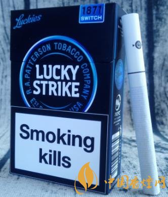 藍(lán)色,本就屬于神秘的色調(diào)。二者結(jié)合起來,帶來的視覺感,無疑更加強(qiáng)烈。撫摸煙盒的六面體,觀賞著黑藍(lán)相融的色調(diào),不失為一種雅趣。圓圈中的LUCKY STRIKE,撫摸起來凹凸感很明顯。翻蓋處1871下方的SWITCH,意為“轉(zhuǎn)變、轉(zhuǎn)換”,也就是指因?yàn)檫^濾嘴內(nèi)置爆珠,從而改變煙的味道。這款歐盟版的煙盒正面上方,沒有印制CLICK(捏破)字樣及爆珠標(biāo)識(shí),煙盒底部和內(nèi)襯錫紙上則有印制。