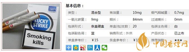 | 類型 :混合型 | 焦油量 :10mg | 煙氣煙堿量 :1mg | 一氧化碳量 :12mg |