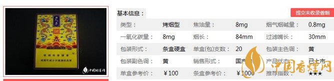 | 類型 :烤煙型 | 焦油量 :8mg | 煙氣煙堿量 :0.8mg | 一氧化碳量 :8mg |