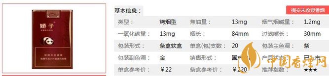 嬌子軟紫國寶煙支長(zhǎng)84mm,過濾嘴長(zhǎng):30mm,該款產(chǎn)品采用了具有自主知識(shí)產(chǎn)權(quán)的復(fù)合生化減害技術(shù),能夠明顯降低煙氣中的有害物質(zhì)。下面我們一起來看嬌子軟紫國寶的參數(shù)信息:焦油量:13mg 煙堿量:1.2mg 一氧化碳量:13mg