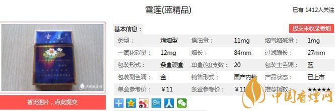 雪蓮藍(lán)精品煙支長(zhǎng)84mm,過濾嘴長(zhǎng)27mm,優(yōu)選國內(nèi)優(yōu)質(zhì)煙葉,應(yīng)用高分子合成技術(shù)等多項(xiàng)現(xiàn)代工藝技術(shù)精制而成;香氣自然、高雅,余味醇厚、干凈舒適。下面我們一起來看雪蓮藍(lán)精品的參數(shù)信息:焦油量:11mg 煙堿量:1.0mg 一氧化碳量:12mg