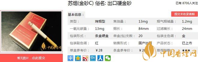 蘇煙(軟金砂C)俗名: 出口硬金砂,外觀包裝設(shè)計體現(xiàn)了時代感和高雅、華貴、時尚、氣派的風格。煙絲金黃油潤,賞心悅目,香氣高雅充足,煙氣柔和豐滿,吃味舒適干凈,形成了“江蘇第一煙”柔、香、雅獨特風格。經(jīng)香煙網(wǎng)小編市場調(diào)查蘇煙軟金砂C售價為28元/包。