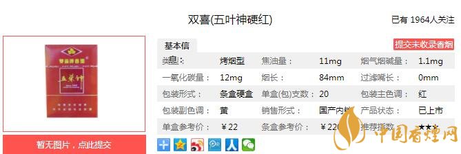 雙喜五葉神硬紅多少錢一包 雙喜五葉神硬紅口感及參數(shù)介紹