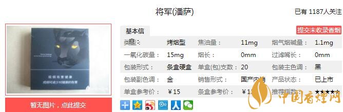 雪茄型卷煙是雪茄和卷煙的融合之作,雪茄型卷煙既符合了年輕、時尚一族消費者新的消費需求,又具有鮮明的時尚個性和濃厚的雪茄風(fēng)格。2010年,山東中煙就推出了一款極具創(chuàng)新風(fēng)格的雪茄型卷煙 ——將軍(潘薩),在上市初期,就以鮮明的時尚個性和濃厚的雪茄風(fēng)格成為了雪茄型卷煙市場的“新寵”,引領(lǐng)中式雪茄新風(fēng)尚。下面就由香煙網(wǎng)小編帶大家一起來了解將軍潘薩的相關(guān)信息。