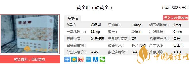 黃金葉硬黃金煙支長84mm,過濾嘴長33mm,煙支的設(shè)計很漂亮,淡粉紅色的葉形狀加上金色的承托,更顯出此煙的與眾不同,握在手里的感覺也十分舒適。下面我們一起來看黃金葉硬黃金的參數(shù)信息:焦油量:10mg 煙堿量:1.0mg 一氧化碳量:11mg