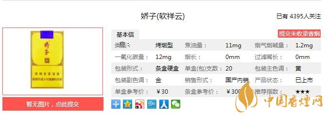 嬌子軟祥云煙支長84mm,過濾嘴長25mm,煙支呈經(jīng)典的767方式排列,從煙支端頭觀察煙絲色澤呈淡黃色,醇化度不深,油潤感一般,細聞,并沒有明顯的酒香溢出,煙草本香為主。下面我們一起來看嬌子軟祥云的參數(shù)信息:焦油量:11mg 煙堿量:1.2mg 一氧化碳量:12mg