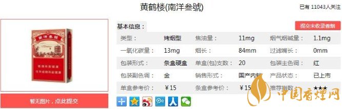 黃鶴樓(南洋叁號)整個煙盒比較復古,后面經(jīng)典的人物商標,作為一個煙民就算不看煙的名字看到后面的封面也知道這一定是黃鶴樓了,側(cè)面是煙的數(shù)值,焦油11可算是中規(guī)中矩了。下面便是黃鶴樓(南洋叁號)的基本參數(shù):焦油量:11mg 煙堿量:1.1mg 一氧化碳量:13mg.