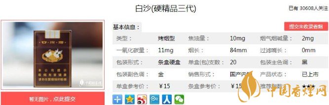 硬精品三代煙盒頂面是三條極為細(xì)致的鐳射鶴舞圖案,加上4條金邊,貫穿煙盒前后,乍眼一看很像軟包煙的封條,鐳射圖案里有一副祥云組成的圖案,里面有個(gè)3個(gè),應(yīng)該是表示精品三代的意思了。底部也是和正面一樣的白沙煙字樣。下面便是白沙(硬精品三代)的基本參數(shù):焦油量:10mg 煙堿量:1mg 一氧化碳量:11mg.