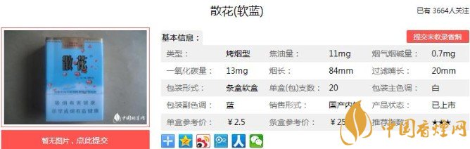 香煙上側(cè)的封標印有河南中煙的字樣和LOGO ,內(nèi)襯紙為銀色。下側(cè)散花二字中間印有兩朵美麗的紅花。左側(cè)理化指標,右側(cè)條碼,都印有黃色花籃狀標志。煙支7-6-7方式排列。黃色雪花濾嘴印有一粗一細兩道金色箍圈,煙支上印有花籃和花朵圖案,中間印有紅色散花漢字,將近占據(jù)煙支部分的二分之一。下面便是散花(軟藍)的基本參數(shù):焦油量:11mg 煙堿量:0.7mg 一氧化碳量:13mg.