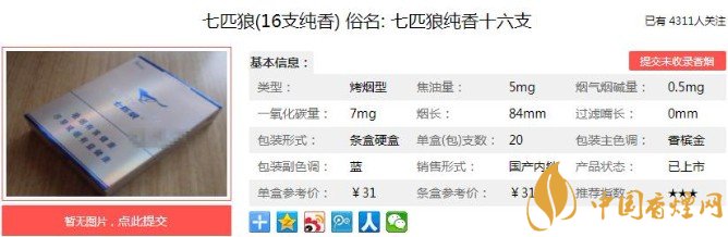 七匹狼外殼采用圓形+弧線+英文+網(wǎng)址,幾乎是純雅狼的翻版,但或許是純香的成本空間較純雅更寬裕的緣故,圓形做成了防偽鐳射,檔次更高。“5mg”字樣,醒目地點(diǎn)明了低焦屬性。下面便是七匹狼(16支純香)的基本參數(shù):焦油量:5mg 煙堿量:0.5mg 一氧化碳量:7mg.