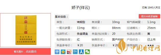 以上便是香煙網(wǎng)小編為大家介紹的關(guān)于祥云嬌子多少錢一包,祥云嬌子價格20元一包的相關(guān)信息,看完之后大家是不是對于嬌子(祥云)這款香煙的相關(guān)信息更加了解呢。大家還想查詢更多的相關(guān)內(nèi)容歡迎點擊:嬌子寬窄平安價格30元一包,傳承寬窄系列的口感!