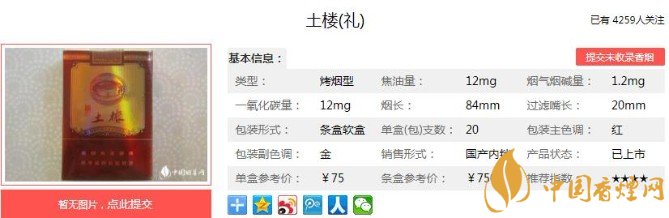 這款香煙的煙氣平衡是非常的不錯(cuò)的,三個(gè)指標(biāo)達(dá)到了平衡的臨界點(diǎn),這也難怪這款香煙可以作為土樓的高檔香煙了。濾嘴的設(shè)計(jì),就顯得比較貴氣高檔,整體的煙支也好看。下面便是土樓(禮)的基本參數(shù):焦油量:12mg 煙堿量:1.2mg 一氧化碳量:12mg.