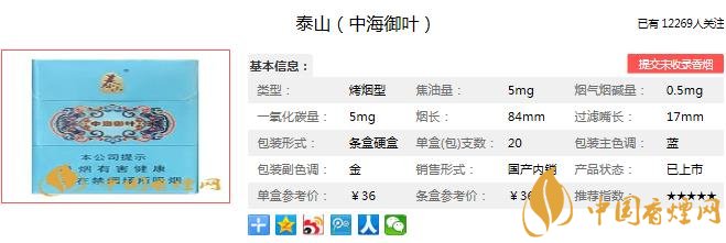 以上便是香煙網(wǎng)小編為大家介紹的關(guān)于泰山中海御葉香煙價格及圖片介紹 高性價比的細支低焦香煙的相關(guān)信息,看完之后大家是不是對于泰山(中海御葉)這款香煙的相關(guān)信息更加了解呢。大家還想查詢更多的相關(guān)內(nèi)容歡迎點擊:泰山香煙價格及圖片 泰山最貴的香煙排行榜