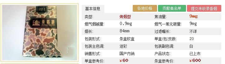 黃鶴樓香煙大彩(硬)綜合應用國內(nèi)多產(chǎn)區(qū)煙葉,凸顯立體吸味。在配方技術上,充分利用增香功能薄片、亮色煙等復合配方技術,在豐富了產(chǎn)品香韻,降低焦油至6毫克。黃鶴樓大彩的煙支采用了焦油標尺刻度,消費者可以輕松了解并掌控攝入的焦油含量。采用大漠迷彩紋飾,賦予產(chǎn)品特別的身份象征,與其他產(chǎn)品形成天然的視覺區(qū)隔,帶、一股特別的時尚硬朗氣息。