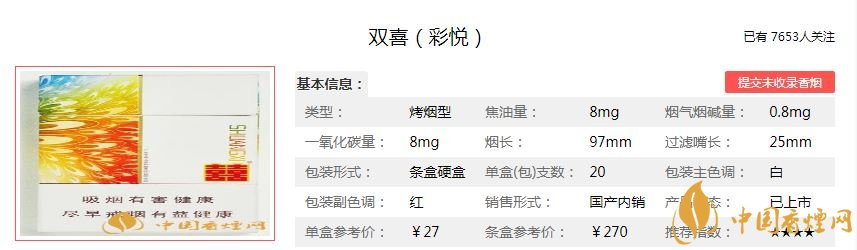 這款煙在廣東反而不多見,包裝簡約之中有炫目多彩的時尚氣息。雙喜彩悅沒有降低煙氣的凹槽,也無兩排細細的降焦線,絕對的素面朝天。香煙價位中等,但是質量比較不錯,值得一品。經調查雙喜彩悅售價為27元/包。