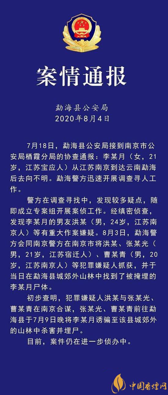 8月4日晚,西雙版納州勐??h公安局發(fā)布通報,經調查尋找,失聯(lián)25天的南京女大學生月月(化名),已于7月9日晚,被其男友洪某伙同張某光、曹某青,誘騙至勐海縣城郊山林殺害并埋尸。