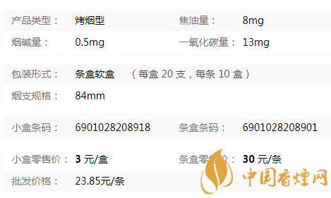 | 類型 :烤煙型 | 焦油量 :11mg | 煙氣煙堿量 :0.8mg | 一氧化碳量 :14mg |