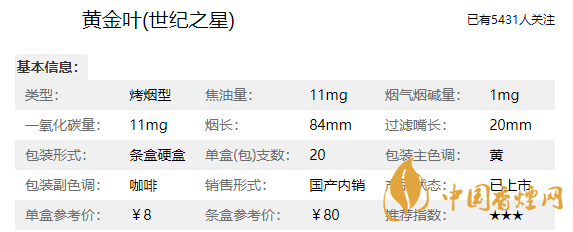 黃金葉香煙品牌定位為中式經(jīng)典醇香型烤煙,一烤透本香、二烤出凈香、三烤成醇香是它的工藝,這款世紀(jì)之星也是完美的繼承了品牌的意志,這款香煙品質(zhì)方面非常的好,那么我們?cè)诮榻B這款黃金葉香煙價(jià)格表和圖片之前,先來(lái)了解一下黃金葉世紀(jì)之星多少錢一盒,它的零售參考價(jià)為8元/包。