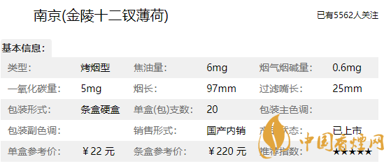 南京金陵十二釵薄荷煙外觀清新典雅,以淡綠色為主色調(diào),配以金陵十二釵美人圖,格調(diào)清新淡雅。整個煙包精致優(yōu)雅,煙支纖細(xì)超長別致,個性鮮明,煙香優(yōu)雅而飄逸,口感細(xì)膩柔和,超低的焦油量,勁道適中,價格適宜。深受廣大煙民的喜愛,特別是女性煙客對它格外青睞。據(jù)小編調(diào)查得知市場銷售參考價為22元/包