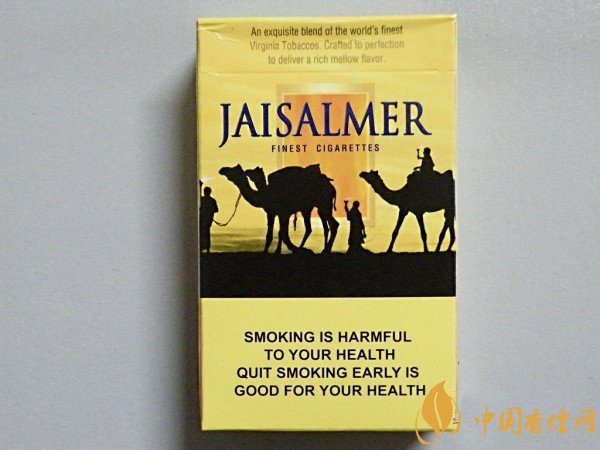 賈沙梅爾黃中免外觀類似美國名煙黃駱駝,它以淡黃色為主打色系,配以沙漠之舟駱駝圖案,給人感覺很有親和力。它采用印度精選的優(yōu)質(zhì)煙葉,通過印度特有的調(diào)香技術(shù),精心調(diào)配出有獨(dú)具印度地方特色混合型香煙。為了對這款中免JAISALMER賈沙梅爾香煙價格有一個詳細(xì)的了解,先來看看這款印度jaisalmer香煙多少錢?據(jù)小編調(diào)查得知市場零售價為12元/包。