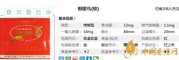 這款相思鳥已經停產了,整個煙盒子,以桔紅色為底色,正面配以一對相思鳥和相思鳥三個字為主體圖案,整體包裝美觀又大方,煙氣濃郁更飽滿,吸味醇正飄逸,口感柔和醇綿。